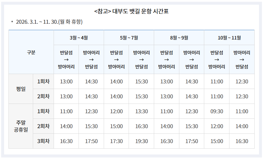 운항 시간은 계절과 일조량에 따라 달라지며 월·화요일은 휴항합니다.