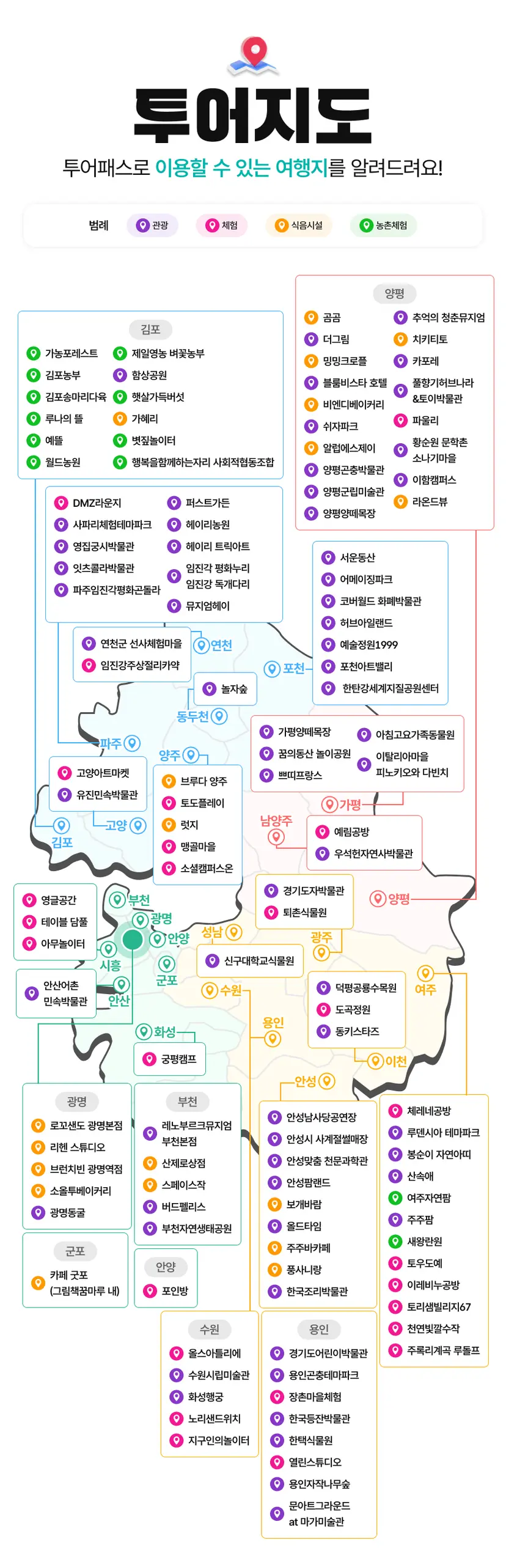 경기투어패스를 이용하면 다음과 같은 관광지를 포함한 120여 개 장소를 자유롭게 방문할 수 있습니다. 가족 단위 여행자, 커플, 친구들과 모두에게 추천되는 장소들이죠.