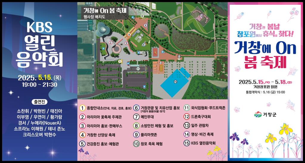이번 행사는 단일 주제가 아닌, 꽃축제와 건강축제, 스포츠와 치유 콘텐츠가 결합된 통합형 축제다. 행사 첫날인 5월 15일에는 KBS 열린음악회가 저녁 7시에 열리고, 16일 오후 3시에는 통합 개막식이 예정돼 있다.