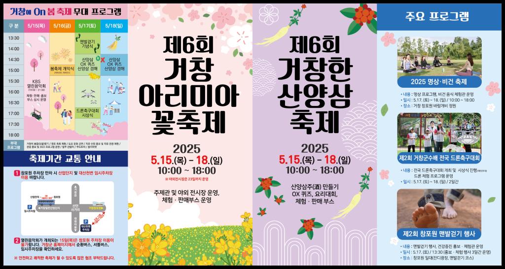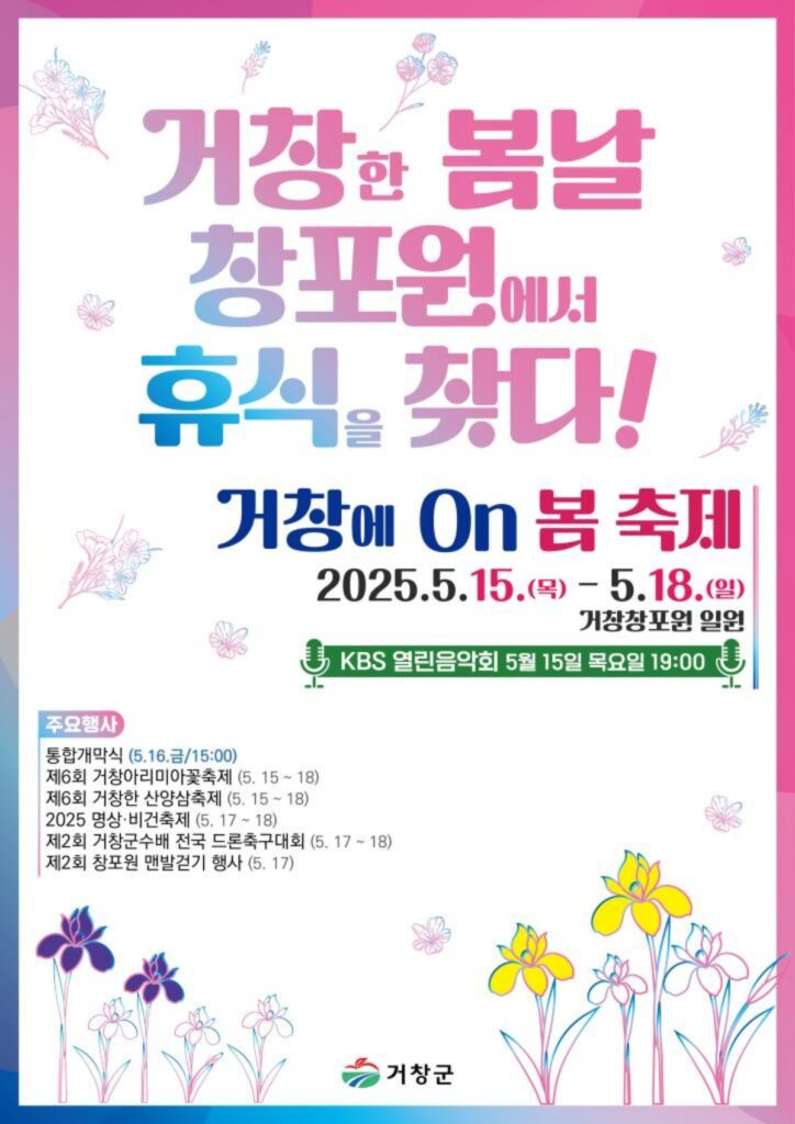 ‘제6회 거창아리미아꽃축제’와 ‘거창한 산양삼축제’가 메인 콘텐츠로 4일간 진행되고, ‘2025 명상·비건축제’, ‘창포원 맨발걷기 행사’, ‘드론축구대회’ 등 체험형 프로그램도 다양하게 펼쳐진다.