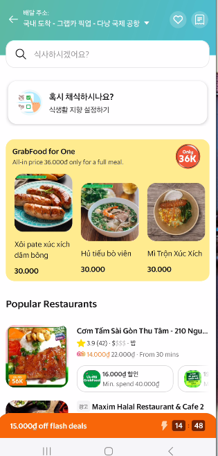 그랩 앱에서 그랩 푸드를 누르면 우리나라 배달 앱과 같이 주면에 배달 가능한 식당, 카페 등이 나옵니다.