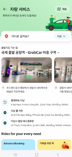 - 이용 서비스 선택: GrabCar(자동차), GrabBike(오토바이) 등 원하는 교통수단을 선택합니다.