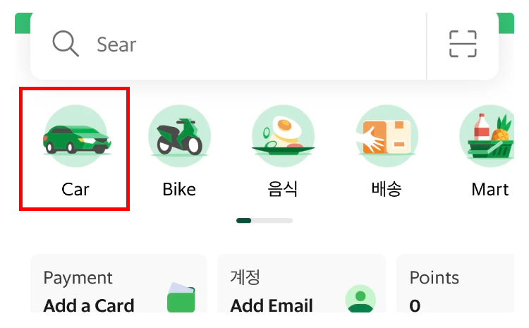 . 홈화면의 자동차, 바이크, 음식, 배송 중에서 자동차를 클릭합니다.