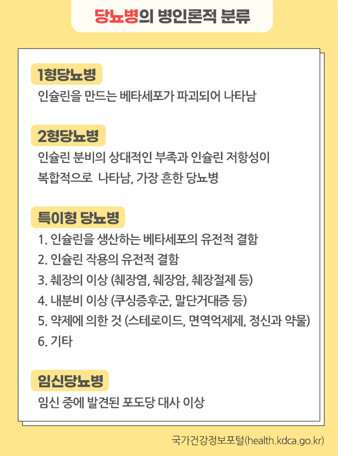 과거에 여러 가지 분류법이 있었으나 현재에는 발병 원인을 바탕으로 일부 임상적 특징을 고려하여 만든 분류법(1형당뇨병, 2형당뇨병, 임신당뇨병 등)을 이용하고 있습니다. 1형당뇨병은 절대적인 인슐린의 결핍을 특징으로 하며, 일반적으로 췌장의 베타세포가 자가면역 기전을 통해 파괴되어 발생합니다. 2형당뇨병은 가장 흔히 볼 수 있는 당뇨병의 유형으로서, 인슐린 분비의 상대적인 부족 혹은 인슐린 저항성의 증가가 복합적으로 작용합니다. 인슐린의 관점에서 보면 상대적 인슐린 결핍 상태라고 볼 수 있습니다. 2형당뇨병 환자는 인슐린을 사용하지 않고 체중조절, 식이, 운동, 경구혈당강하제 등을 통해서 적절한 혈당조절을 할 수 있습니다. 그러나 일부는 인슐린 분비능력이 떨어져 있어서 인슐린을 주사해야 혈당이 조절되는 경우도 있습니다. 하지만 1형당뇨병은 췌장의 베타세포가 광범위하게 파괴되어 인슐린이 절대적으로 결핍된 상태이므로, 인슐린의 투여가 반드시 필요합니다.