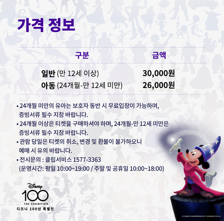 입장권 가격은 일반(12세 이상) 30,000원, 아동(24개월 이상 12세 미만) 26,000원입니다.
