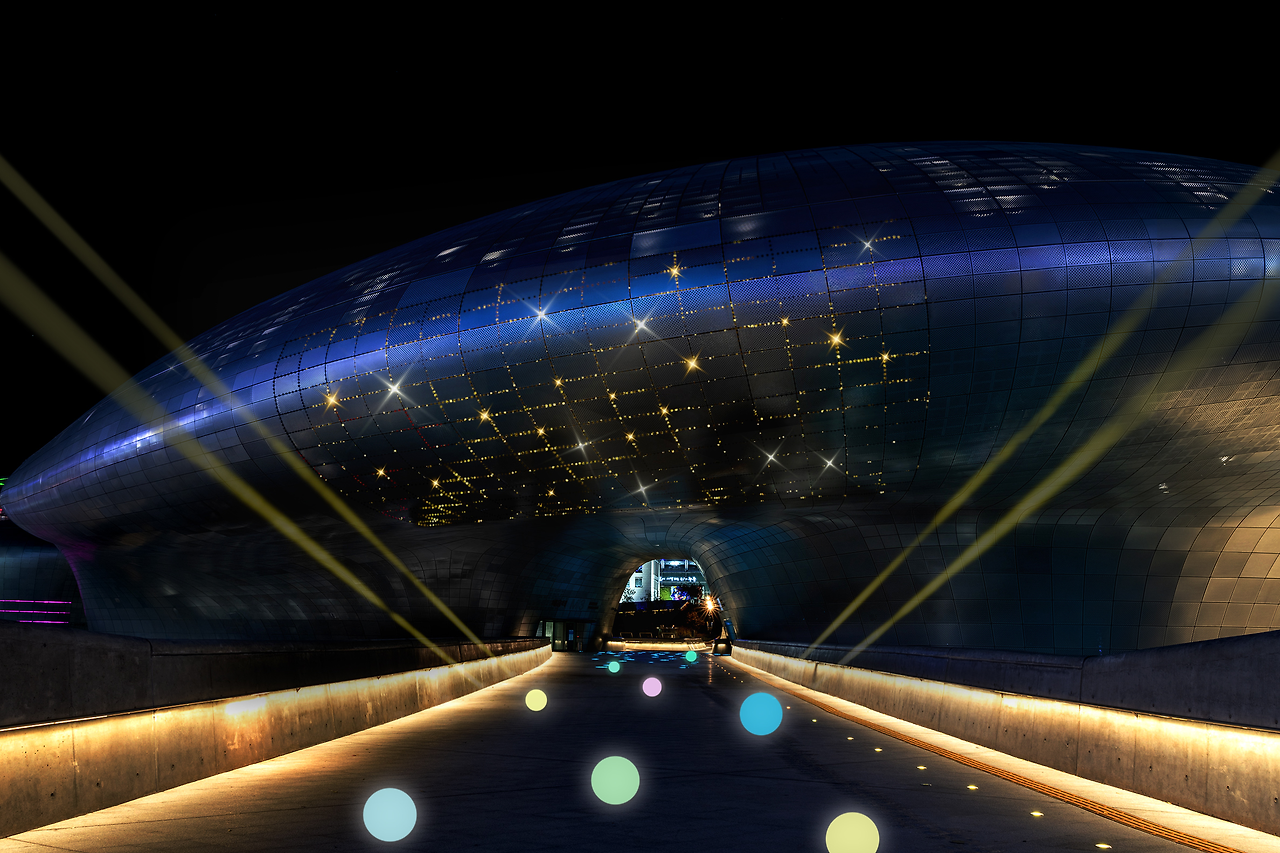 DDP의 외장패널을 활용하여 색채변화, 강약, 점멸 등 다양한 빛의 효과가 펼쳐지는 새로운 형태의 조명 쇼