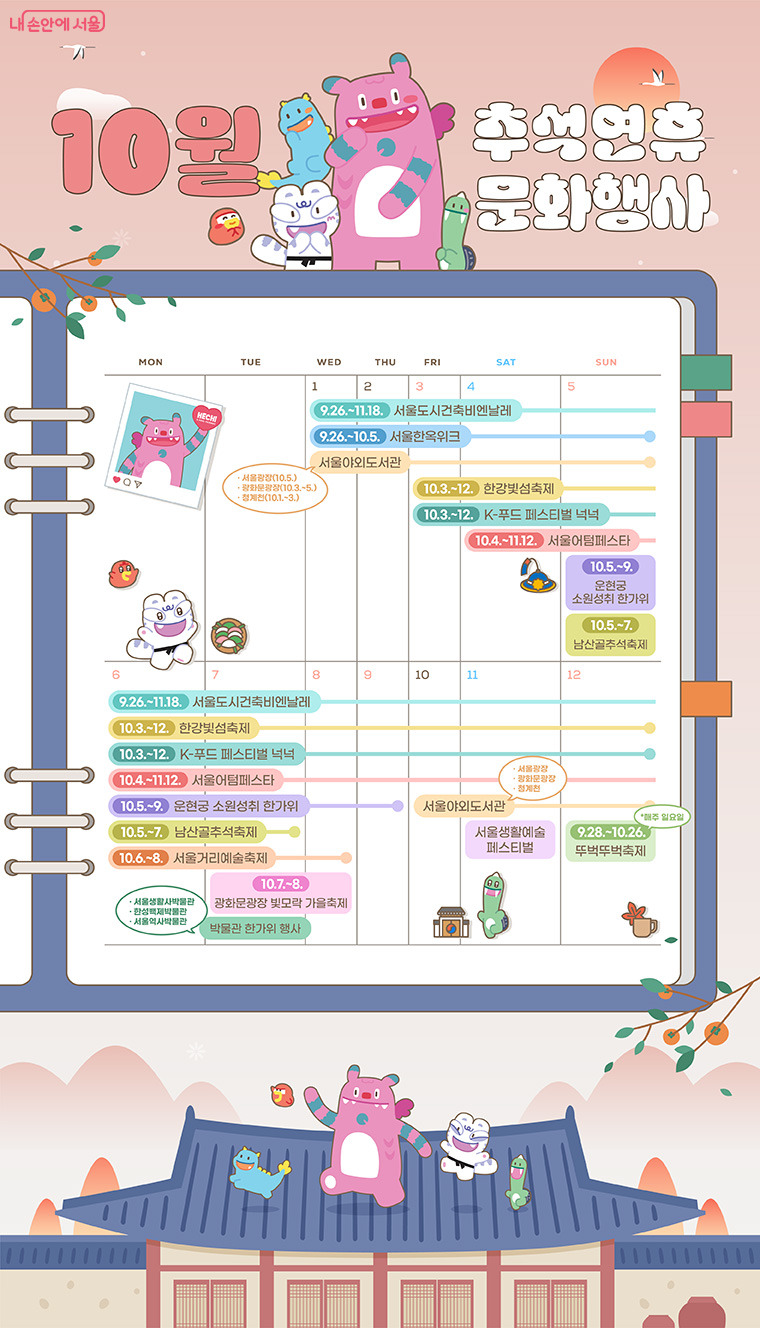 모처럼 찾아온 황금연휴, 하루만 휴가 내면 자그마치 열흘을 쉴 수 있는 절호의 기회인데요, 아직 연휴 계획이 없다면 오늘 기사 주목~ 기나긴 연휴를 알차게 보내게 도와줄 ‘10월 추석연휴 문화행사’를 공개합니다. 가을 분위기 물씬 풍기는 축제부터 전통문화를 체험할 수 있는 행사까지 다채롭게 준비돼 있습니다.