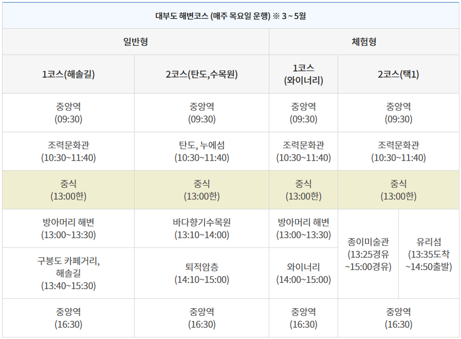운항 시간은 계절과 일조량에 따라 달라지며 월·화요일은 휴항합니다.