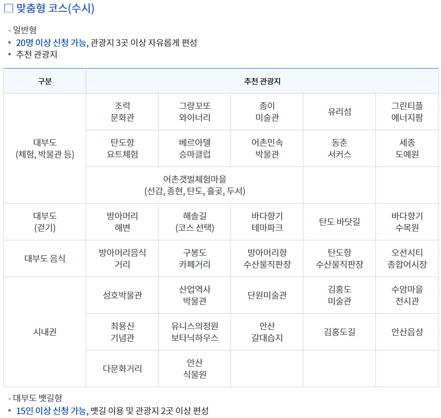 ㆍ 일반형(20명 이상), 대부도 뱃길형(15명 이상 가능)