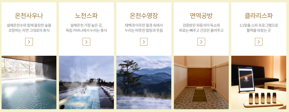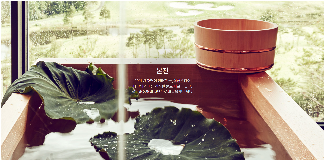 최고 수질의 설해온천수가 풍부하게 공급되며 울창한 숲을 조망하는 노천온천과 편백향 가득한 사우나는 물론 락카와 파우더룸까지 자연이 그대로 느껴지는 휴식의 파라다이스입니다.
