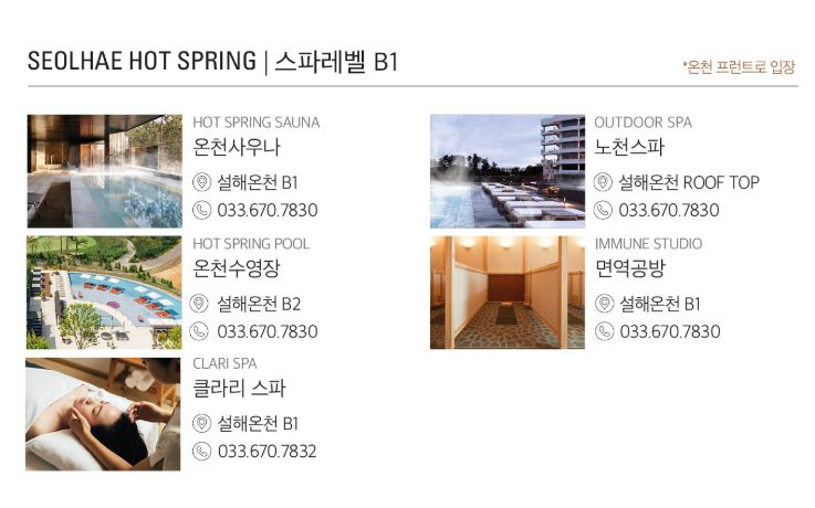 - * 온천사우나는 설해온천 스파레벨(B1) 온천프론트를 통해 입장하실 수 있습니다.