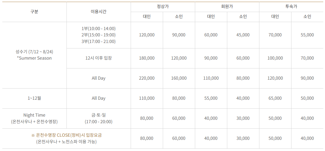 | Night Time (온천사우나 + 온천수영장) | 주말(금-일) 17:00 - 20:00 | |