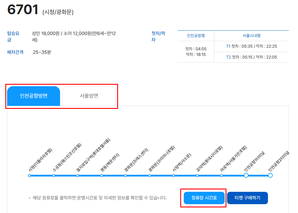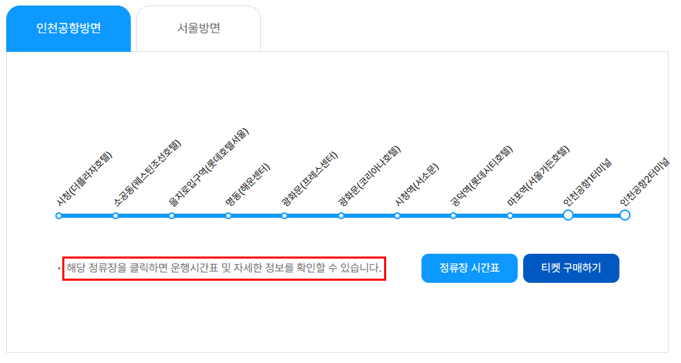 3. 인천공항방면 또는 서울 방면 선택 하시면 해당 버스의 노선 확인 후 정류장 시간표 확인 하시기 바랍니다.