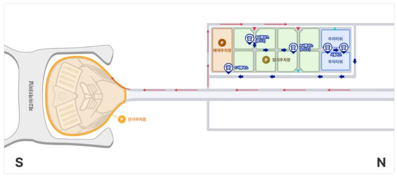 제2여객터미널의 주차장은 단기주차장과 장기주차장으로 나뉩니다. 단기주차장은 터미널 인근에 위치하며, 장기주차장은 터미널에서 떨어진 곳에 있어 순환 셔틀버스로 이동해야 합니다. 셔틀버스는 5~16분 간격으로 운영되며, 터미널 간 이동에는 약 15분이 소요됩니다.
