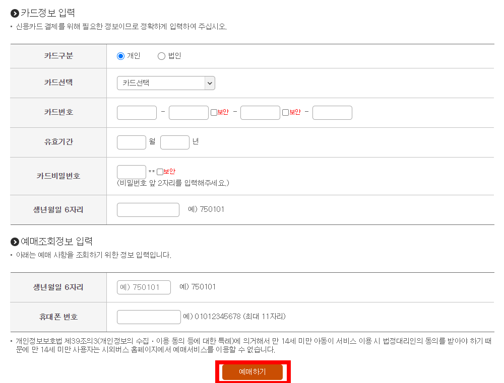 5. 카드 정보를 입력하고 예매 버튼을 눌러 예약을 마칩니다.