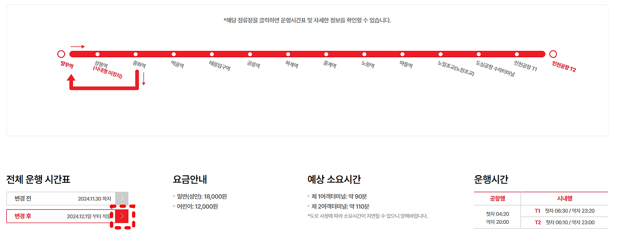 3. 해당 공항버스의 노선도를 확인 하신후 왼쪽 하단 전체운행시간표를 누르시기 바랍니다.