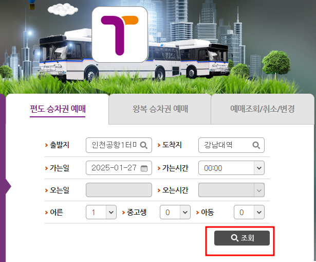 2. 출발지, 도착지, 탑승 날짜 선택 후 조회하시기 바랍니다
