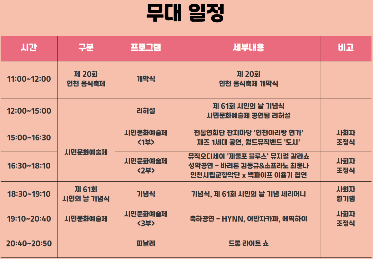 | 2025 인천음식축제 | 10:00∼20:00 | · 음식 전시·홍보 · 특별이벤트(비빔밥, 대형케이크 커팅) · 시민참여체험 |