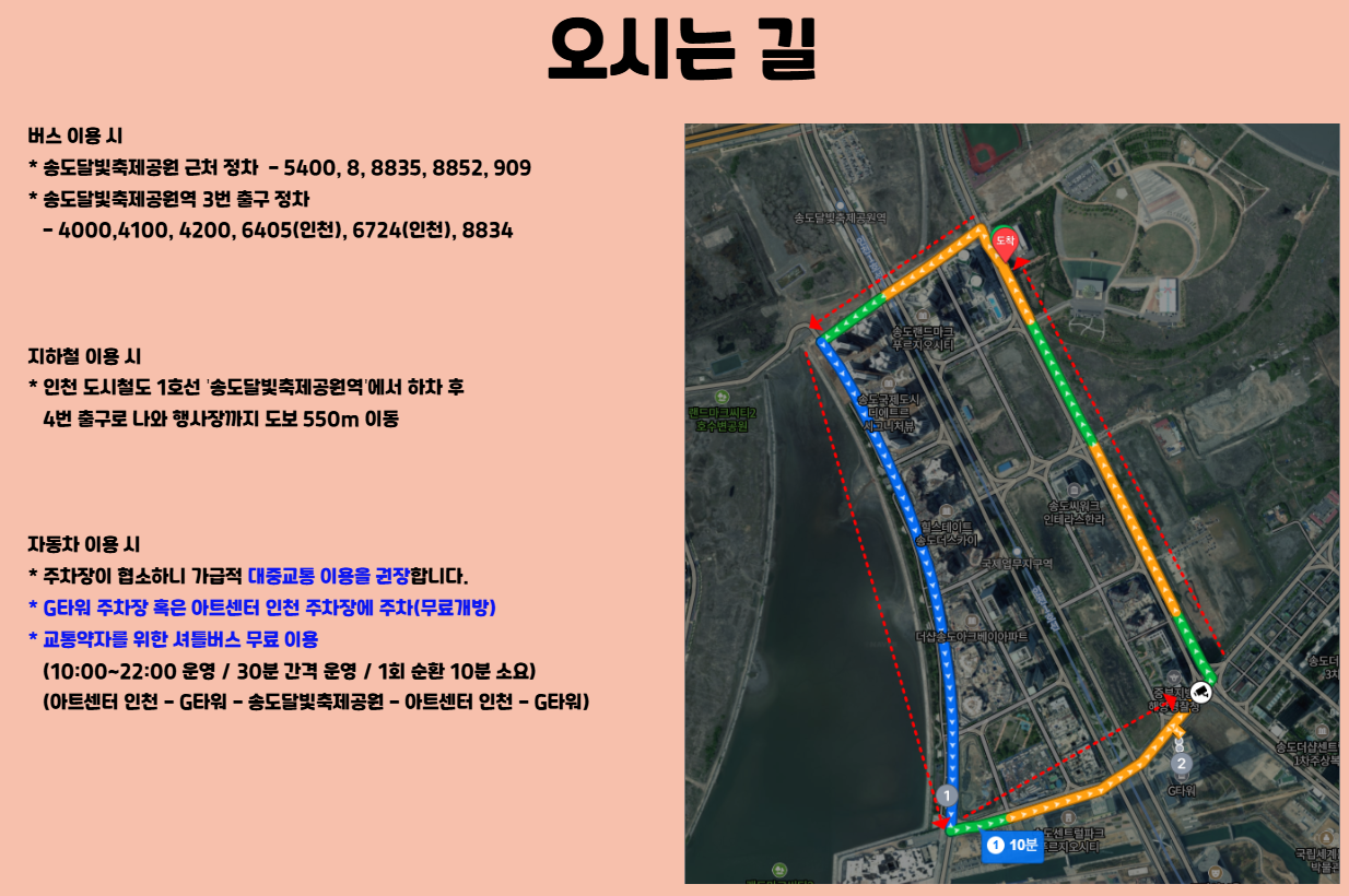 * 행사 당일 송도 달빛축제공원 혼잡이 예상되어 자전거, 전동킥보드 등의 운행이 제한될 수 있습니다