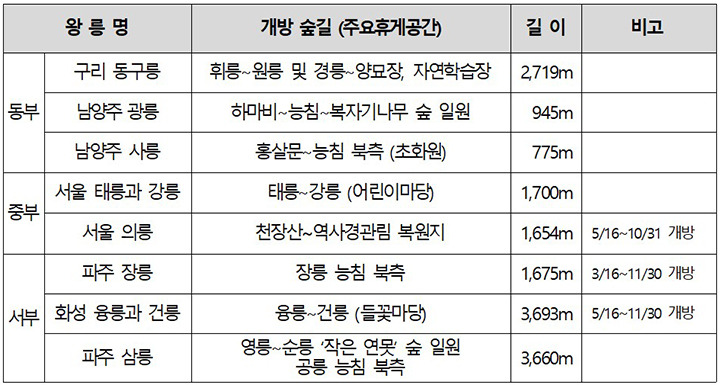 이와 관련해 지난해 11월 폭설 피해로 인해 현재 정비공사 중인 여주 영릉과 영릉 '영릉 외곽 숲길(3.4㎞)'은 이번 개방에서 제외됐다.