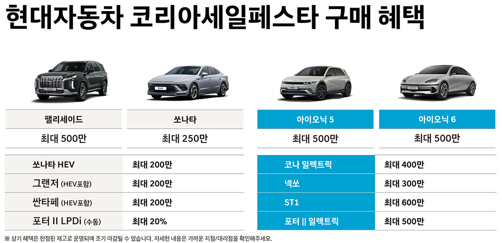 현대차 : 쏘나타·산타페(최대 200만 원) 등 총 24종 할인기아차 : K8 HEV(최대 7%) 등 총 8종 할인