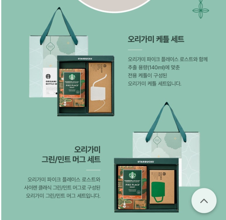 | 오리가미 그린/민트 머그 세트 - 오리가미 파이크 플레이스 로스트와 사이렌 클래식 그린/민트 머그로 구성된 머그 세트 / 30,000원~31,000원 |