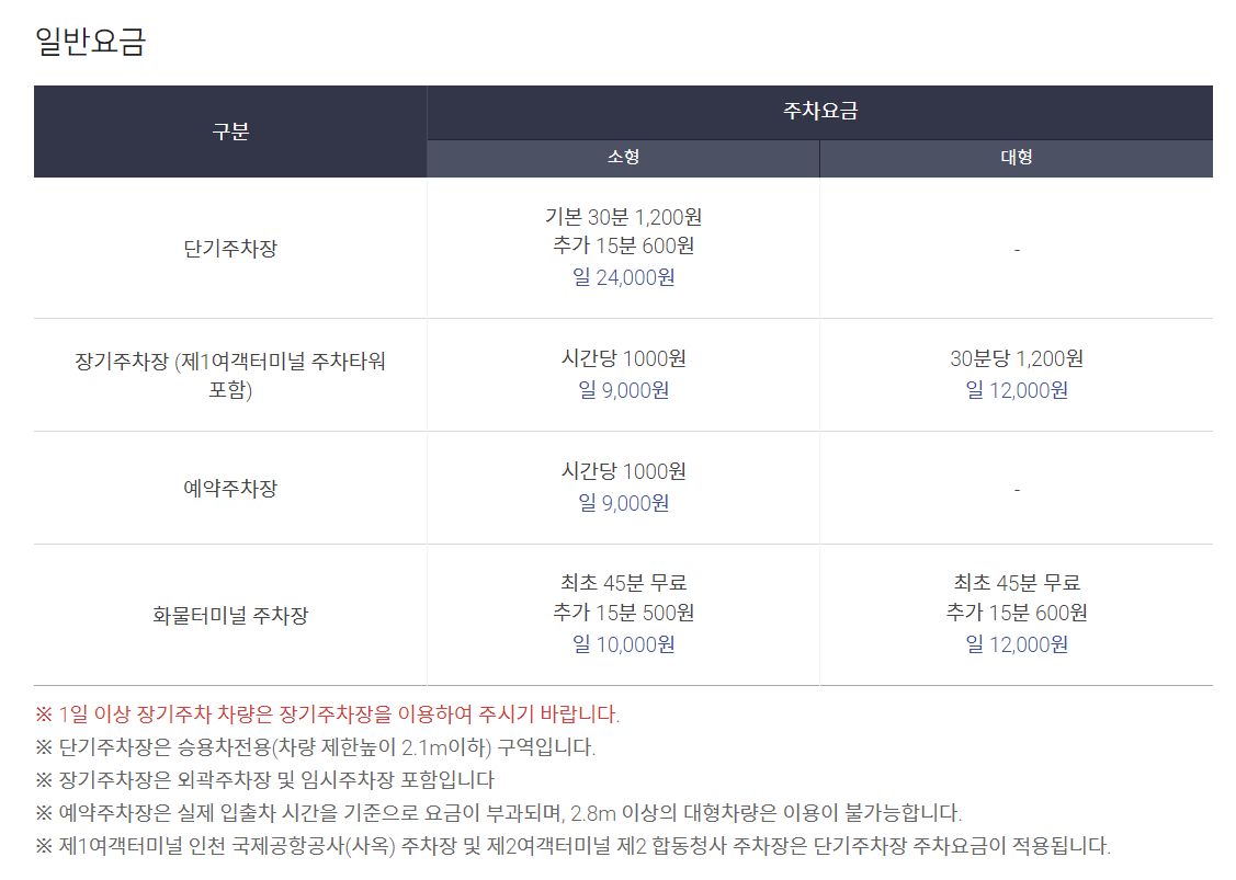 인천공항 주차장은 단기주차장과 장기주차장으로 구분되며, 차량 크기에 따라 요금이 다르게 적용됩니다.