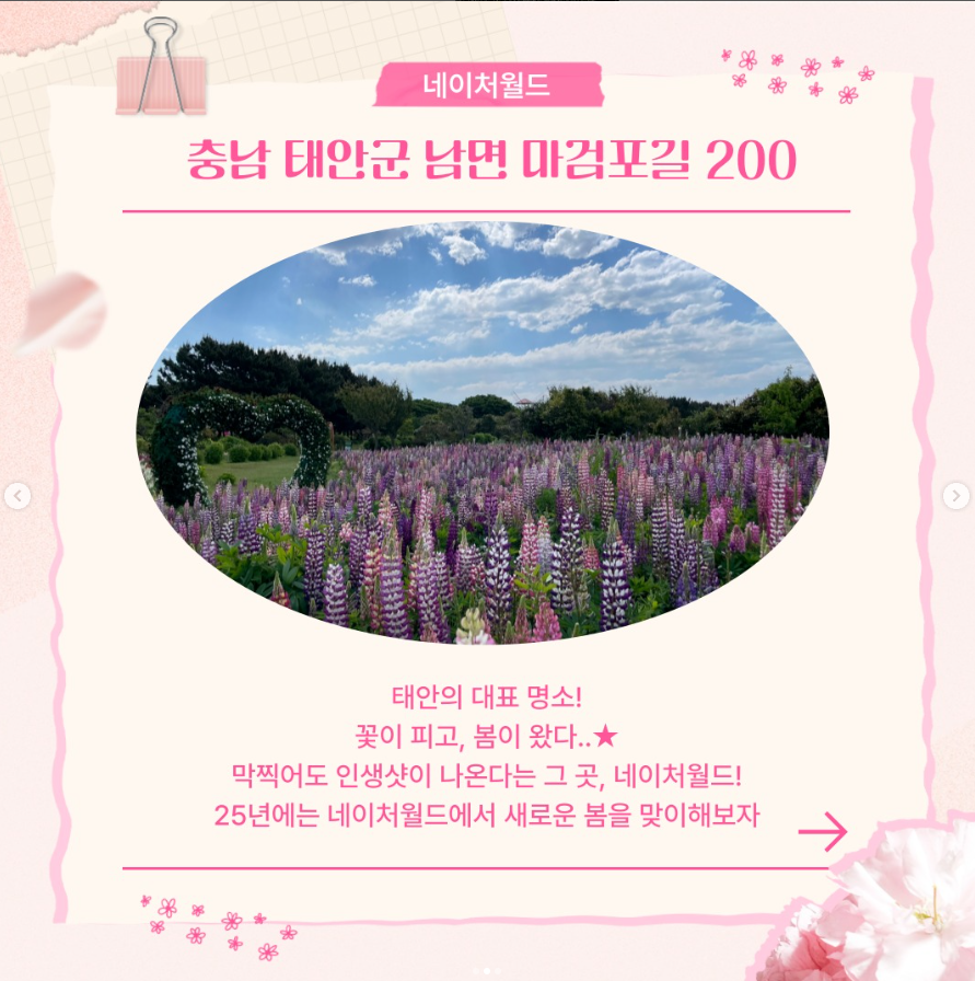 - 공유하기 – 태안 봄꽃정원 공식 홈페이지에 게시된 포스터 또는 이벤트 글을 개인 SNS(블로그, 페이스북, 인스타그램 등)에 공유합니다.