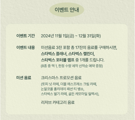 이번 이벤트의 미션 음료는 크리스마스 시즌에 맞춰 특별 제작된 인기 음료들로 구성됩니다.